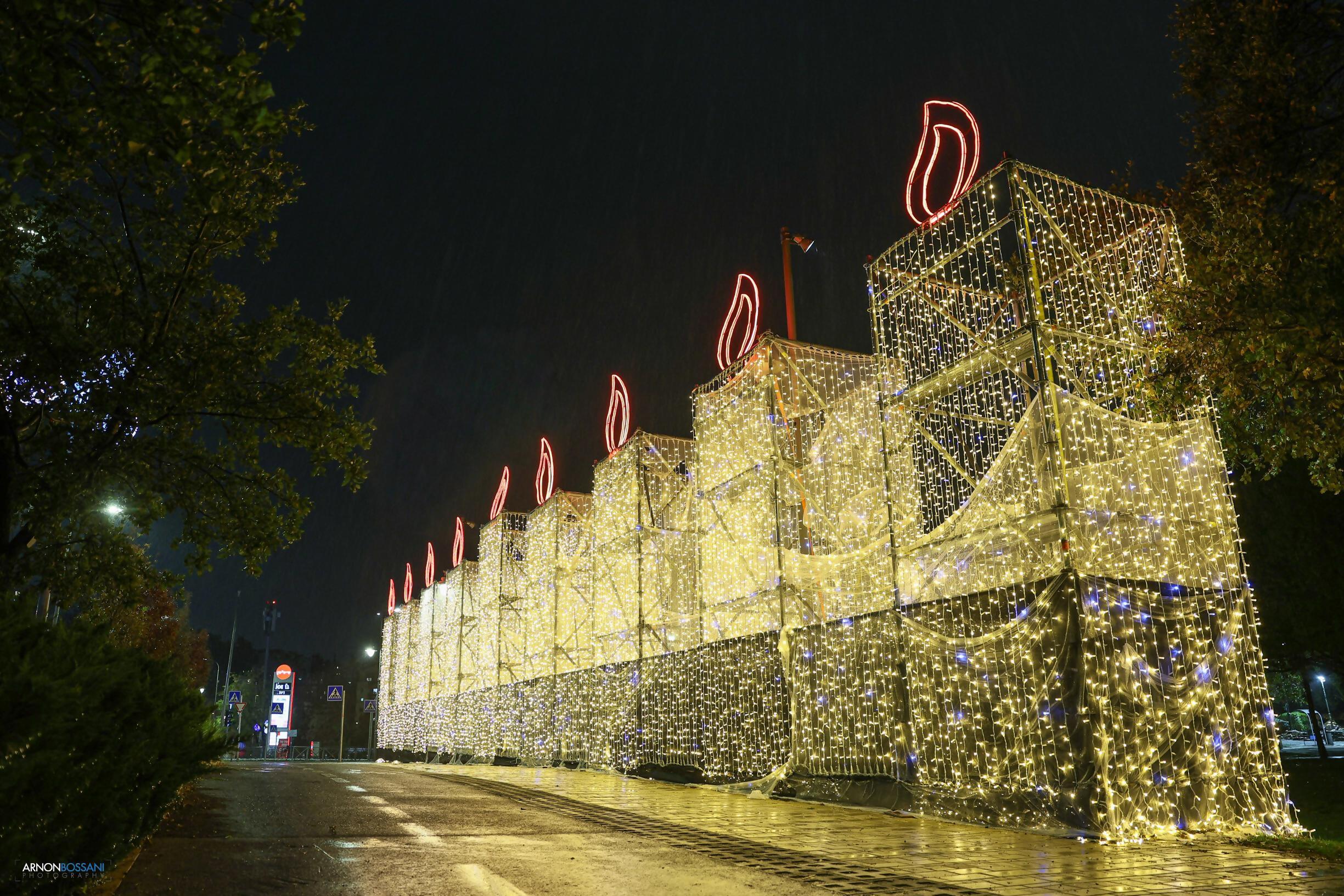 Installation réalisée à partir d’échafaudages et de milliers de lumières fixées sur une structure en maillage